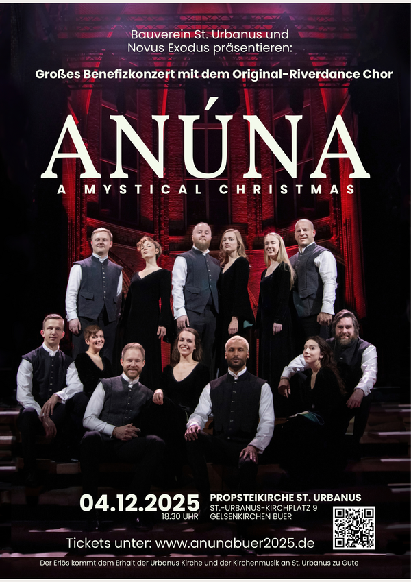 Der Chor präsentiert sein Programm „A Mystical Christmas“. Infos, Trailer und Tickets gibt es online auf www.anunabuer2025.de. Der Erlös des Konzerts kommt dem Erhalt der St.-Urbanus-Kirche und der Kirchenmusik an St. Urbanus zugute.