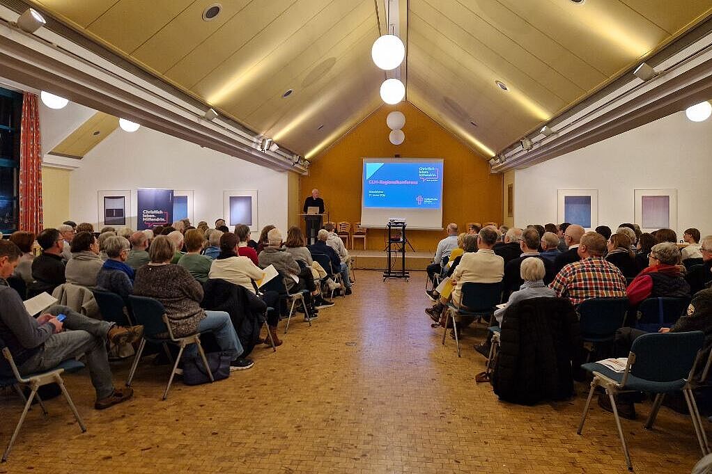 Das Bistum Essen hatte gemeinsam mit Stadtdechant und Propst Markus Pottbäcker zur Regionalkonferenz eingeladen, um über den Transformationsprozess „Christlich leben. Mittendrin.“ (CLM) zu informieren. Rund 150 Menschen aus ganz Gelsenkirchen folgten der Einladung und ließen sich von Programm-Manager Johannes Vutz und Generalvikar Klaus Pfeffer die Modellvorschläge für eine Stadtkirche und eine Stadtpfarrei vorstellen.