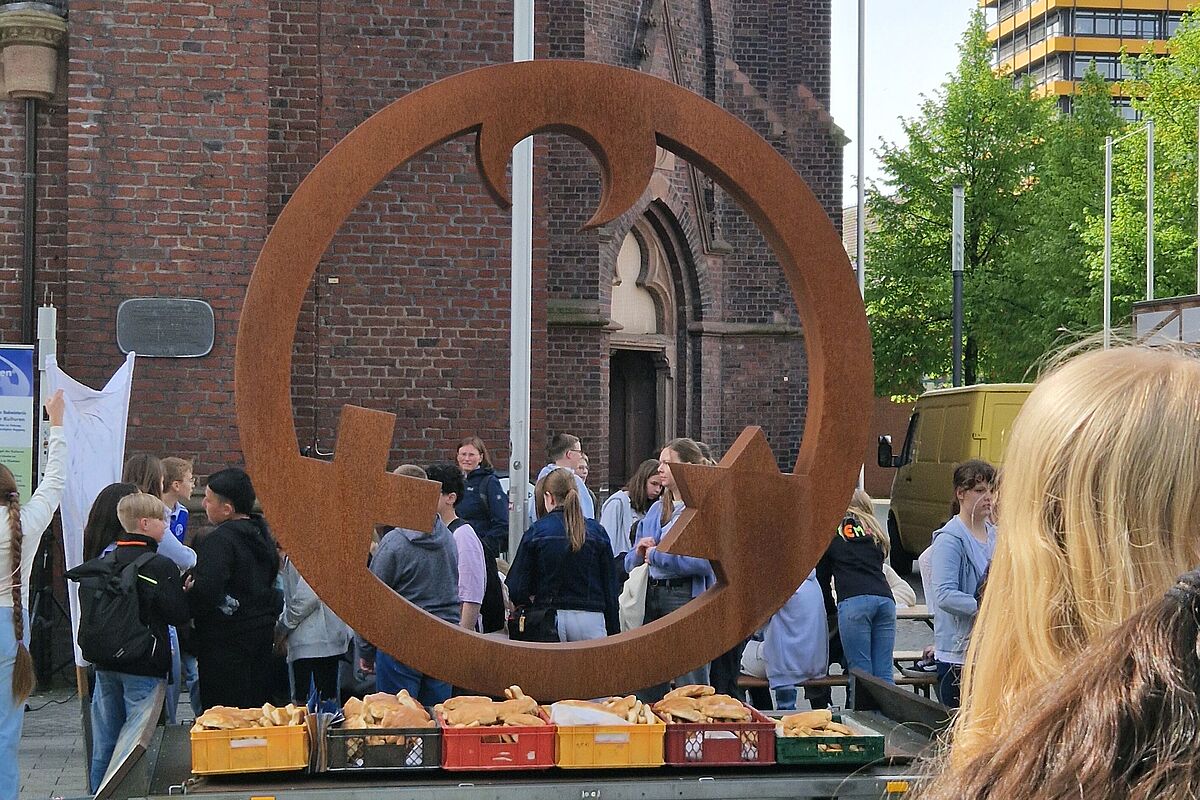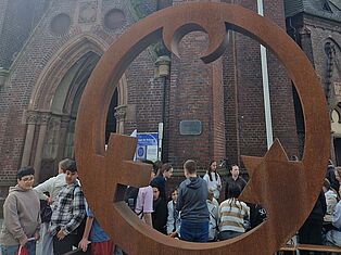 Am Montag war richtig was los auf dem Heinrich-König-Platz: Über 20 Schulklassen und Kita-Gruppen aus der Umgebung kamen zur Eröffnung des „Engels der Kulturen“ zusammen. Die Skulptur, die die Symbole der drei abrahamitischen Religionen in einem Kreis verbindet, steht jetzt bis zum 22. Mai direkt vor dem Kirchenportal.
