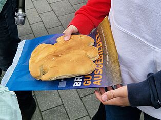 Zum Abschluss gab es noch eine süße Überraschung: 200 „Engel-Weck“, kleine Hefegebäcke in Engelform, wurden verteilt und gemeinsam genossen. Nach gut anderthalb Stunden endete der Eröffnungs-Tag. Die Skulptur auf dem Platz und die begleitende Ausstellung in der Propsteikirche kann noch bis zum 22. Mai betrachtet werden. Herzliche Einladung!