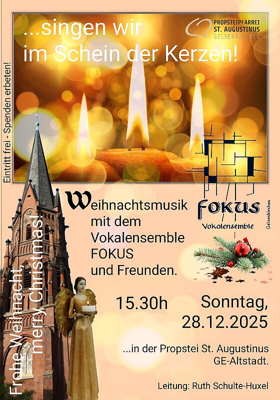 Am Sonntag, den 28.12. um 15:30 Uhr lädt das Vokalensemble „FOKUS“ unter der Leitung von Ruth Schulte-Huxel in die Propsteikirche St. Augustinus am Heinrich-König-Platz ein. Unter dem Motto „...singen wir im Schein der Kerzen“ gibt es Weihnachtsmusik und Texte zum Zuhören und Mitsingen. Gemeinsam mit dem Ensemble musizieren Peter-René Steiner (Orgel) und Sonja Reinsfelder (Klavier). Der Eintritt ist frei, über eine Spende würden wir uns freuen. Herzliche Einladung!
