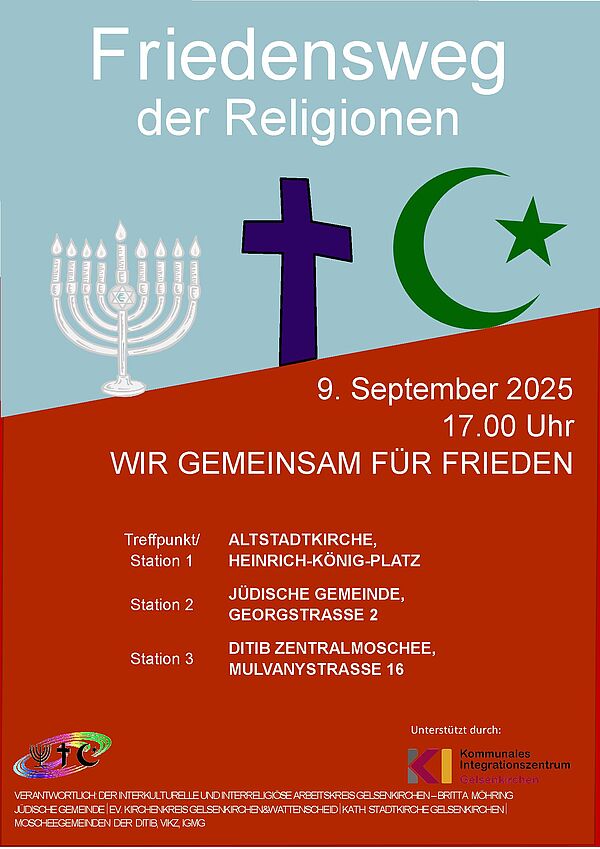 Am 9. September um 17 Uhr findet der Friedensweg der Religionen des interreligiösen und interkulturellen Arbeitskreises statt. Treffpunkt ist in diesem Jahr um 17 Uhr an der ev. Altstadtkirche (Heinrich-König-Platz). Anschließend geht es über die Neue Synagoge (Georgstraße 2) zur Ditib Zentralmoschee (Mulvanystraße 16). Schließen Sie sich an und setzen Sie damit ein wichtiges Zeichen des interreligiösen Dialogs!