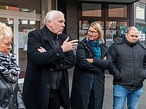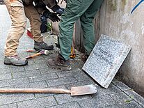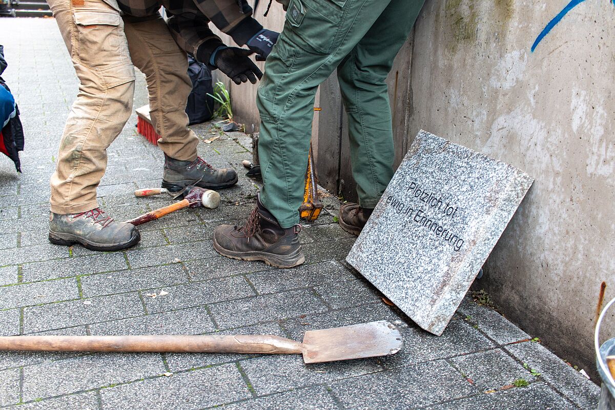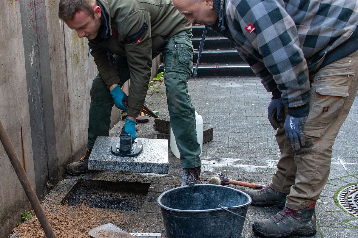 Schon während der Arbeiten wurden Passantinnen und Passanten – darunter auch Freunde und Bekannte von Bördi – auf die Gedenkplatte aufmerksam, deren Verlegung sehr begrüßt wurde. In einer kleinen Ansprache erinnerte Propst Pottbäcker an die unverlierbare Würde jedes Menschen – und mahnte, gerade im Zusammenhang mit der aktuellen „Stadtbild-Diskussion“ an, niemandem diese Würde abzusprechen.