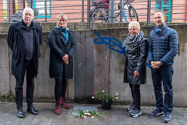 Am Montag, dem 27. Oktober, wurde die Gedenkplatte mit der Inschrift „Plötzlich tot – ewig in Erinnerung“ an Bördis Stammplatz verlegt – direkt unter dem handgeschriebenen Nachruf an der Mauer. Bei der kleinen Feier waren Caritas-Direktor Michael Hegemann, Bezirksbürgermeisterin Marion Thielert, Christoph Fuß, Leiter der Caritas-Wohnungslosenhilfe, sowie Karin Schneider und Jennifer Ruhnau von Arzt Mobil anwesend.