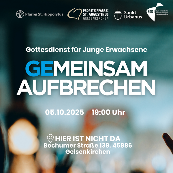 Herzliche Einladung zum ersten Gottesdienst für junge Erwachsene – dieses Mal im "Hier ist nicht da" – am Sonntag, den 5.10.2025 um 19 Uhr. Der Gottesdienst unter dem Motto "GEmeinsam aufbrechen" ist organisiert und vorbereitet von jungen Menschen aus den drei Gelsenkirchener Pfarreien und dem BDKJ. Eine Anmeldung ist nicht erforderlich. Komm einfach vorbei!