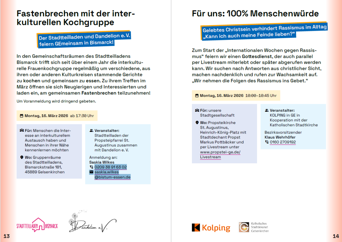 Ebenfalls am 16. März um 17:30 Uhr findet in den Räumen des Stadtteilladens Bismarck (Bismarckstraße 181) ein Fastenbrechen mit der interkulturellen Kochgruppe statt. Um Voranmeldung bei Saskia Wilkes unter 0209/38 91 63 02 oder per E-Mail unter saskia.wilkes@bistum-essen.de wird gebeten.