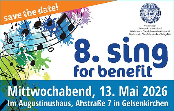 Mitsingen ausdrücklich erwünscht: Zum achten Mal laden die Soroptimistinnen der Gelsenkirchener Clubs Buer und Ruhrgebiet zu einem musikalischen Abend ein, der gute Laune macht – und gleichzeitig Gutes tut. Das beliebte Rudelsingen "Sing for Benefit" findet am Mittwoch, dem 13. Mai um 19:30 Uhr im Augustinushaus (Ahstr. 7) statt. Einlass ist bereits ab 18.30 Uhr. Der Eintritt beträgt 15€ im Vorverkauf (inkl. einem Glas Sekt) und 18€ an der Abendkasse. Auch für das leibliche Wohl ist bestens gesorgt.
