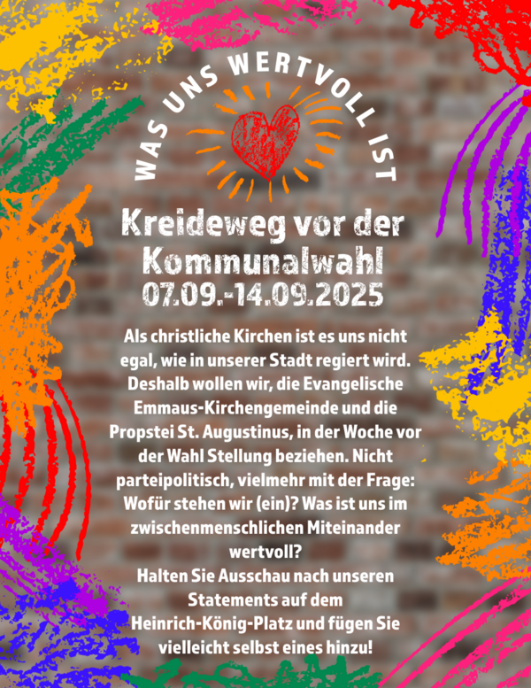Gemeinsam mit der Ev. Emmaus-Kirchengemeinde gestalten wir ab dem 7. September einen mit Kreide markierten Weg an den beiden Kirchen am Heinrich-König-Platz. Entlang der Wege werden – gut sichtbar im Stadtbild – Worte, Gedanken und Standpunkte notiert, die zeigen, wofür wir als Christ*innen einstehen und was wir zu gesellschaftlichen Fragen beizutragen haben. Halten Sie Ausschau nach unseren Statements und fügen Sie gerne selbst welche hinzu!