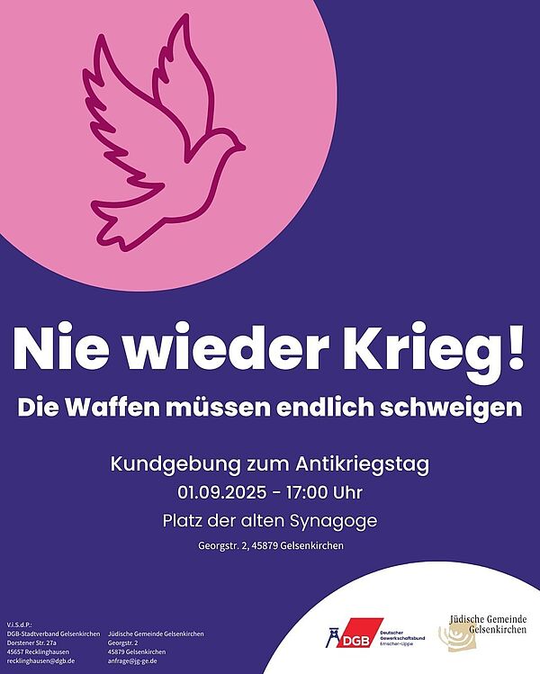 Unter dem Motto "Nie wieder Krieg! Die Waffen müssen endlich schweigen" findet am 1. September um 17 Uhr auf dem Platz der alten Synagoge (Georgstraße 2) eine Kundgebung zum Antikriegstag statt. Veranstalter ist der Deutsche Gewerkschaftsbund Emscher-Lippe in Verbindung mit der Jüdischen Gemeinde Gelsenkirchen.