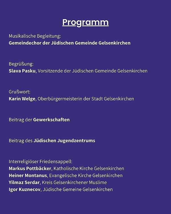 Mit musikalischer Begleitung des Gemeindechors der Jüdischen Gemeinde Gelsenkirchen, einem Grußwort der Oberbürgermeisterin, Beiträgen der Gewerkschaften und des Jüdischen Jugendzentrums sowie einem interreligiösen Friedensappell der katholischen und evangelischen Kirche Gelsenkirchen, des Kreises Gelsenkirchener Muslime und der Jüdischen Gemeinde.