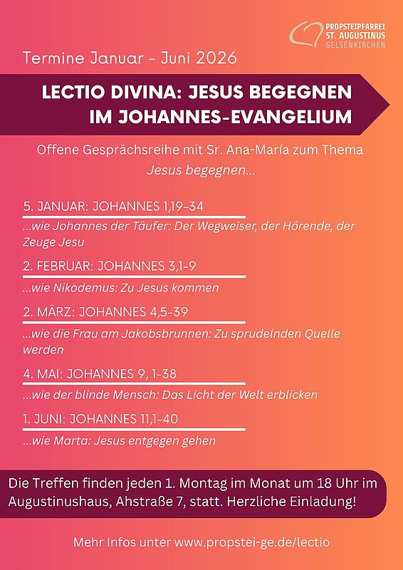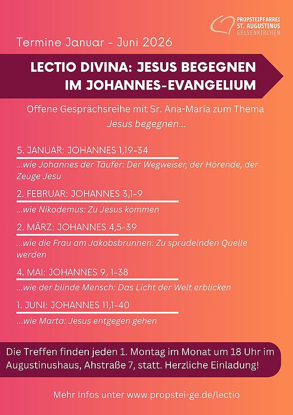 Das Johannesevangelium trägt zahlreiche Titel, darunter "Das Evangelium der Dialoge" oder "Das Evangelium der Begegnungen". Die Begegnungen, die heilen, würdigen, begleiten und Leben schenken sind der Schwerpunkt der Treffen der Lectio-Divina-Gruppe. Die Treffen finden immer am 1. Montag des Monats um 18 Uhr im Augustinushaus statt. Sie sind jederzeit herzlich eingeladen, an diesen Treffen teilzunehmen.