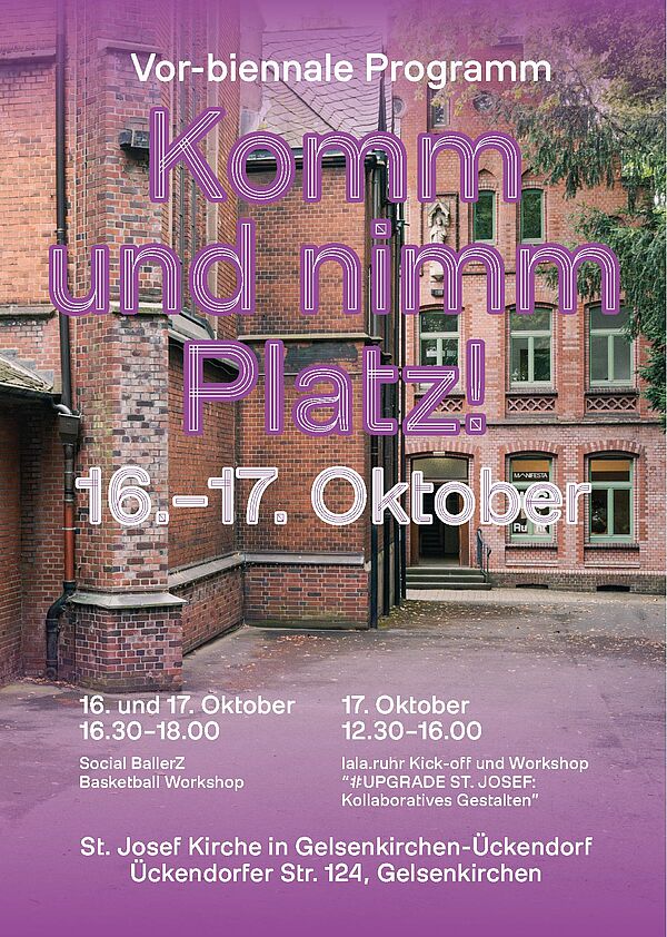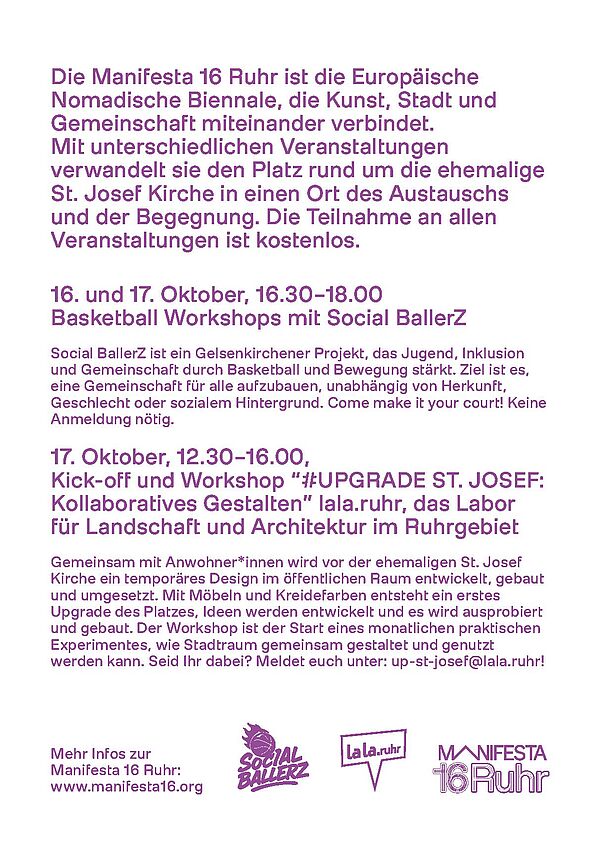 Die Manifesta 16 Ruhr ist ein Veranstaltungsformat, das Kunst, Stadt und Gemeinschaft miteinander verbindet. Mit unterschiedlichen Veranstaltungen verwandelt sie den Platz rund um die ehemalige Kirche St. Josef in einen Ort des Austauschs und der Begegnung. Am 16./17. Oktober finden hier zwei Veranstaltungen statt, die Teilnahme ist kostenlos. Herzliche Einladung!