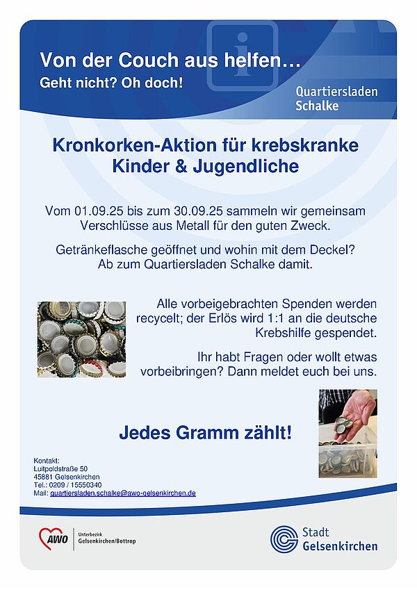 Kronkorken aus Metall lassen sich gut recyceln - der Erlös kann dann sinnvoll eingesetzt werden. Genau das tun im September der Quartiersladen Schalke und ganzjährig der Stadtteilladen Bismarck und unterstützten so die (Kinder-)Krebshilfe. Sammeln Sie mit!