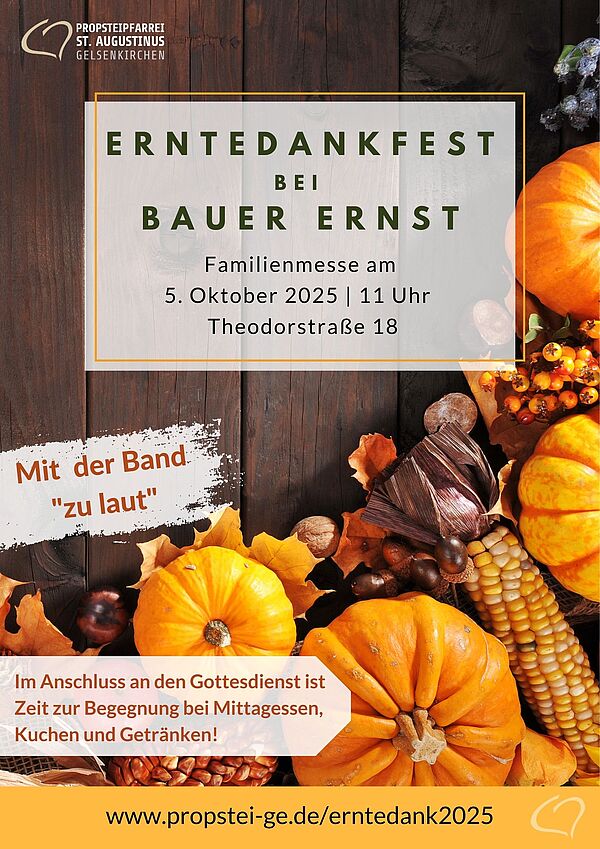Auch in diesem Jahr findet das Erntedankfest wieder auf dem Hof von Bauer Ernst statt. Um 11 Uhr wird eine Familienmesse gefeiert, anschließend gibt es die Gelegenheit, bei Essen und Getränken ins Gespräch zu kommen. Um Kuchenspenden wird gebeten!