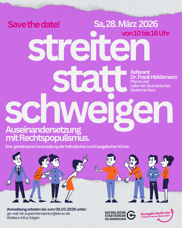 Die katholische und die evangelische Kirche laden ein zum ökumenischen Workshop-Tag zum Thema "Auseinandersetzung mit Rechtspopulismus" am 28. März von 10–16 Uhr. Eingeladen sind alle haupt- und ehrenamtlichen Mitarbeitenden beider Kirchen. Eine Anmeldung bis zum 6. März ist erwünscht unter: ge-wat-kk.superintendentur@ekvw.de