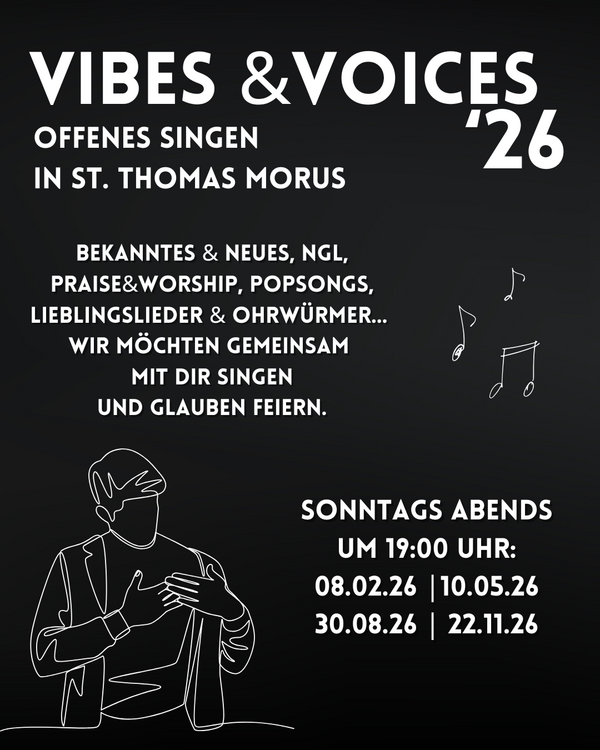 Das offene Singen in St. Thomas Morus geht in die nächste Runde! Am 8.2. um 19 Uhr gibt es erneut die Möglichkeit, singend den Glauben zu feiern. Auch drei weitere Termine für 2026 stehen fest!