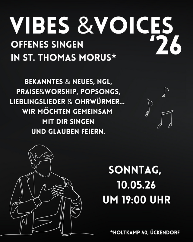 Alle Sängerinnen & Sänger aufgepasst: Das nächste Vibes & Voices in St. Thomas Morus in Ückendorf findet am 10. Mai statt. Kommt vorbei und bringt Freund*innen mit!